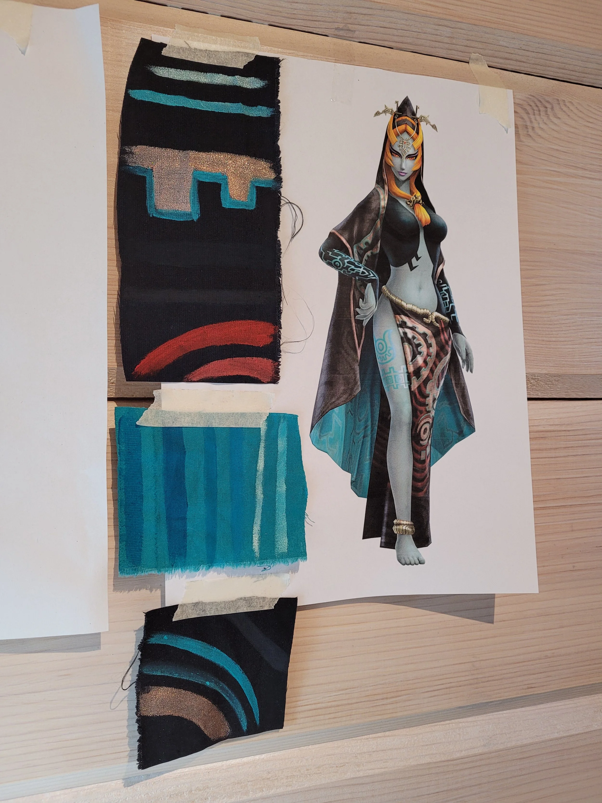 The designs for the thigh I drew from the Hyrule Warriors reference, pattern on the arms was traced from 3d model’s textures. Arm patterns I printed in thrtee parts as they were so complex and the paint isn’t easiest to handle.