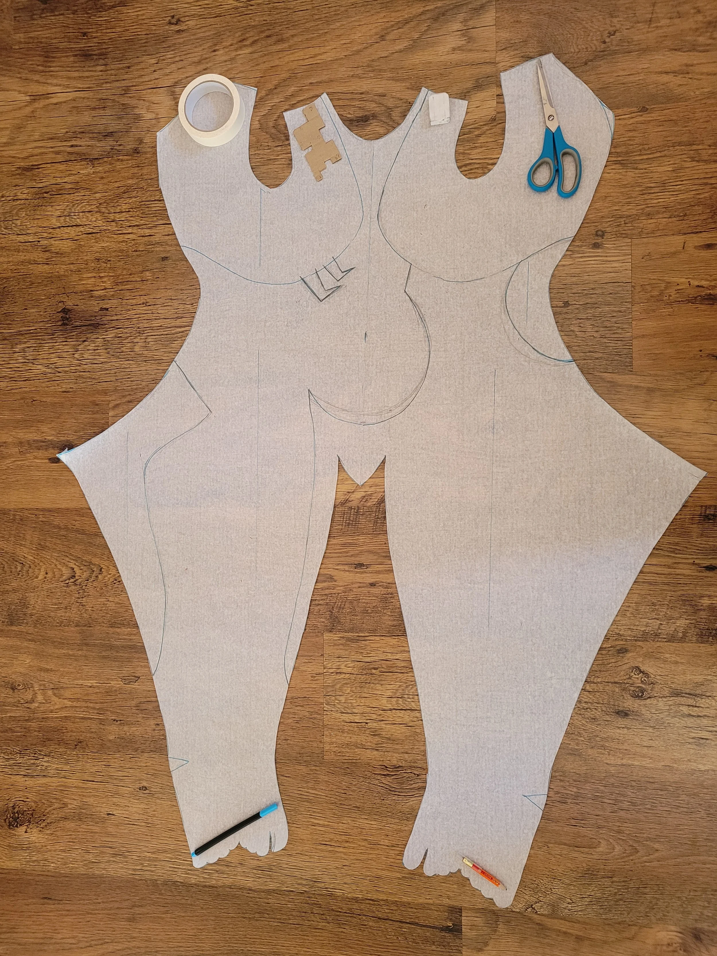 After getting the suit proportions right and everything fit nicely, I traced Midna’s body patterns on the latest prototype while I was wearing it. After taking the suit off, I compared the piece of clothing to my pattern and traced the designs on the pattern as I didn’t want to cut the prototype to pieces.
