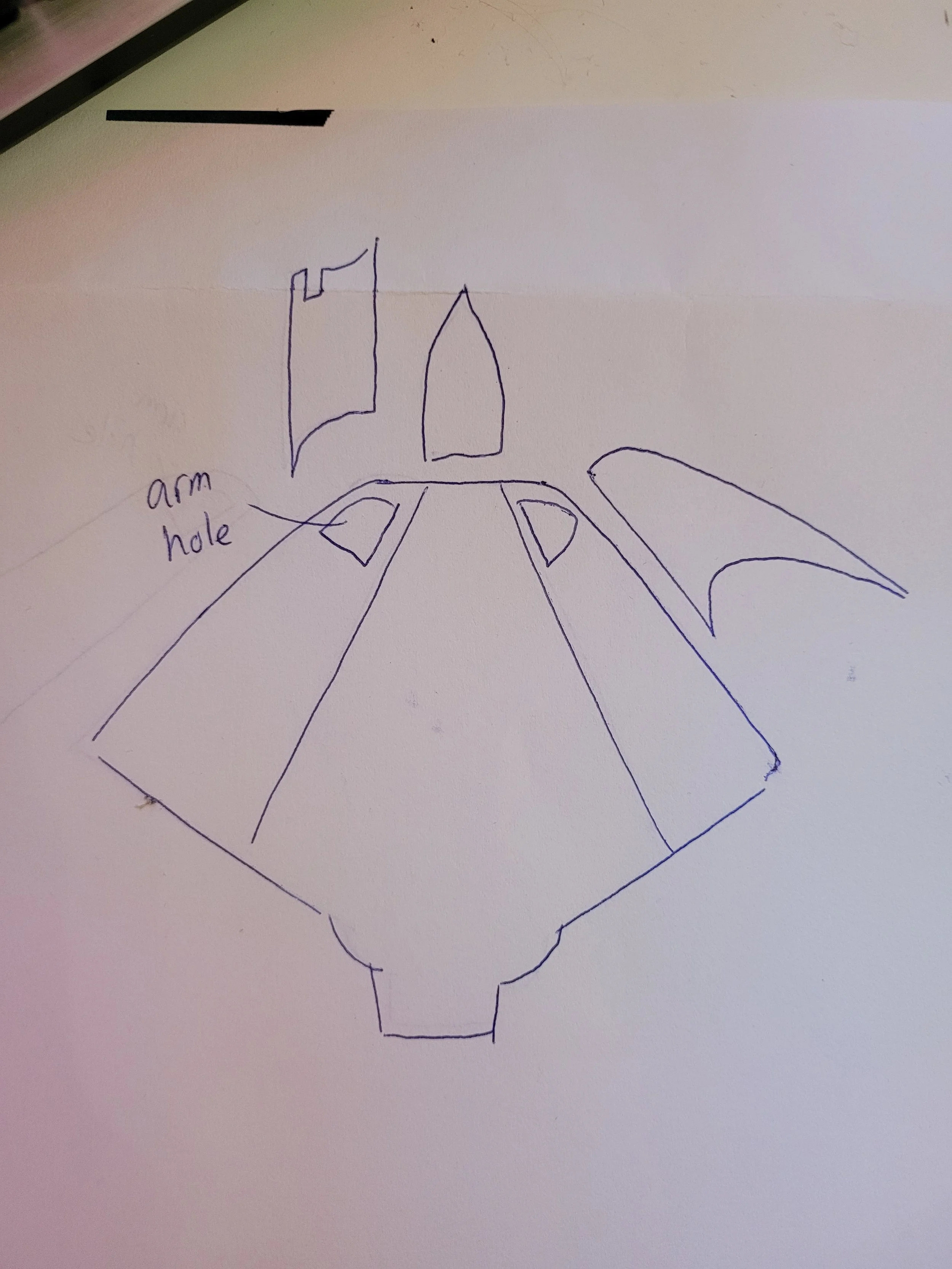My final cloak pattern looked somewhat like this. Arm holes were cut and tidied after whole thing was complete. I reduced the hem width A LOT from other people’s patterns to achieve similar flow to the reference picture. The sleeve part was sandwiched between the back side seams.